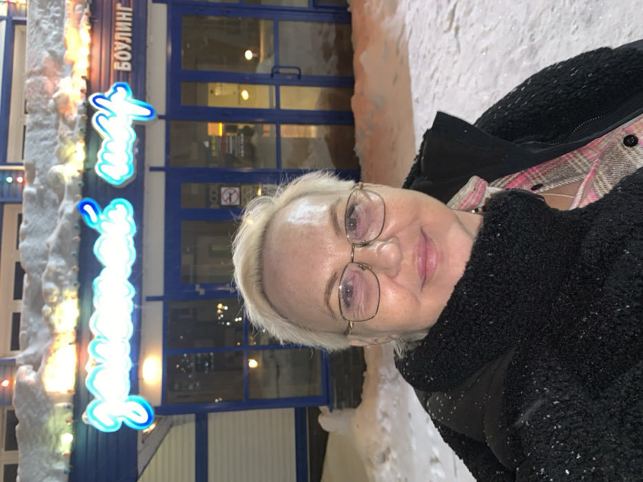 An adult female with short blonde hair and gold-framed eyeglasses smiles subtly while posing for a photograph outdoors at night. She is dressed in a black textured winter jacket over a pink and white plaid shirt, revealing a silver-colored necklace. The background features the entrance to a commercial building with blue-framed windows and glass doors, obscured partially by the woman. A prominent blue neon sign above the entrance spells "ЗВЕЗДНЫЙ ШАР" (Zvezdny Shar) and "БОУЛИНГ" (Bowling), identifying the establishment as the "Star Ball" Bowling alley in Chaikovsky, Russia. Snow covers the ground and the building's awning, which is adorned with multi-colored string lights. A "No Smoking" symbol is visible on one of the glass doors.