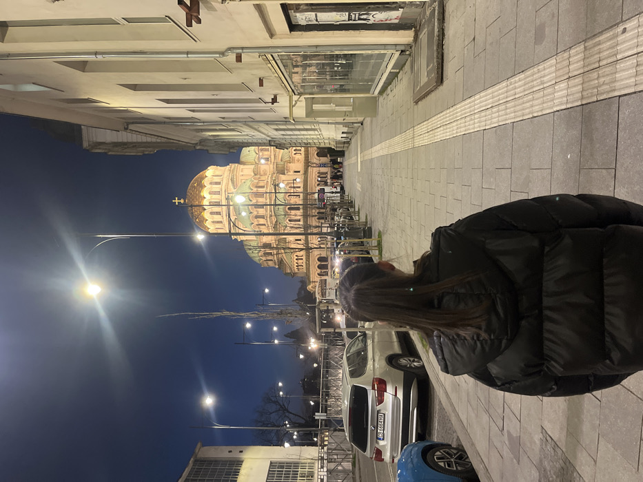 The image depicts an urban street scene at night in Sofia, Bulgaria, looking towards the St