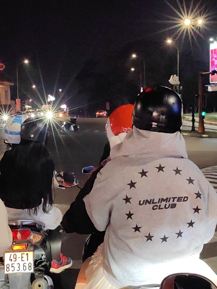 The image depicts an urban street scene at night in Da Lat, Lâm Đồng province, Vietnam. Three individuals on motorbikes are visible, appearing to be stationary or moving slowly in traffic. In the foreground, viewed from behind, is a person wearing a black helmet and a grey hooded sweatshirt with the text "UNLIMITED CLUB" encircled by twelve black stars on its back. This person is a passenger on a motorbike, behind a driver wearing a red helmet, partially visible between the foreground and left subjects. To the left, a second person is seen from behind, wearing a black helmet and a black top over white lower garments, seated on a white motorbike. The white motorbike displays a Vietnamese license plate "49-E1 853.68". Red and blue sneakers are visible on the left subject's left foot. The environment is illuminated by numerous streetlights and vehicle headlights, which create distinct starburst effects. A green traffic light signal is visible on the far right. Several other vehicles, including motorbikes and cars, are discernible in the distance. Buildings with illuminated windows line the street in the background.