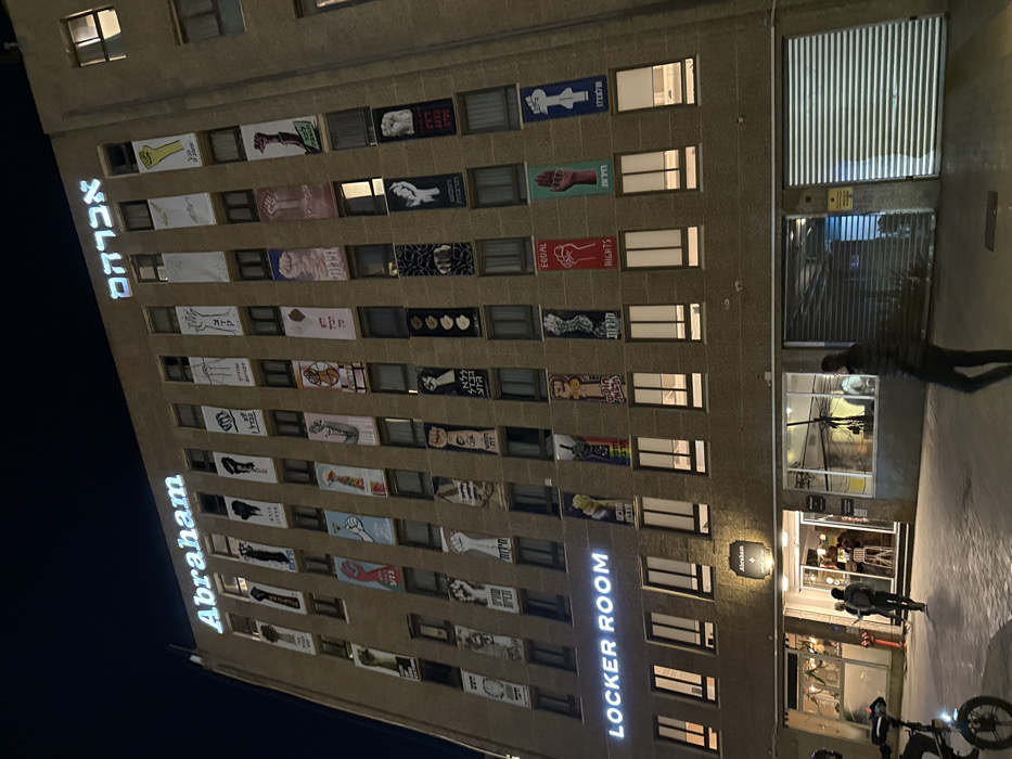 An urban building at night displays numerous banners hanging from its windows, each showing a different artistic representation of a fist. The building has a sign reading "Abraham" in neon letters. Another sign says "Locker Room." People walk past the building's entrance, and a bicycle is parked nearby. The overall scene suggests a statement about solidarity or empowerment through art.