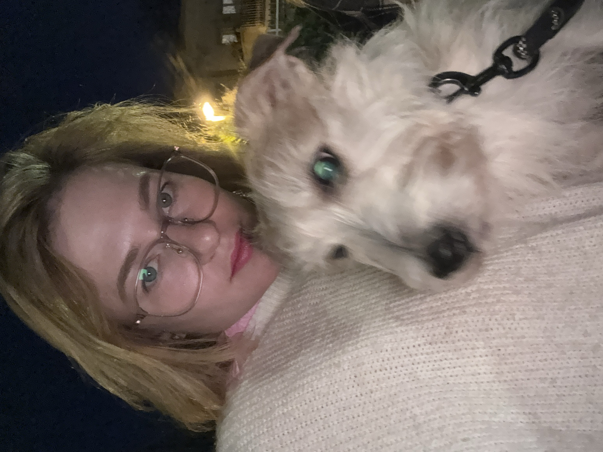 A woman and a dog are in a selfie photo. The woman has blond hair, wears glasses, and pink lipstick. She is wearing a white sweater and a light pink shirt can be seen underneath. The dog is light-colored with fluffy fur and is wearing a black leash. A yellow streetlight is blurred in the background. The location is assumed to be Tel-Aviv, Israel.