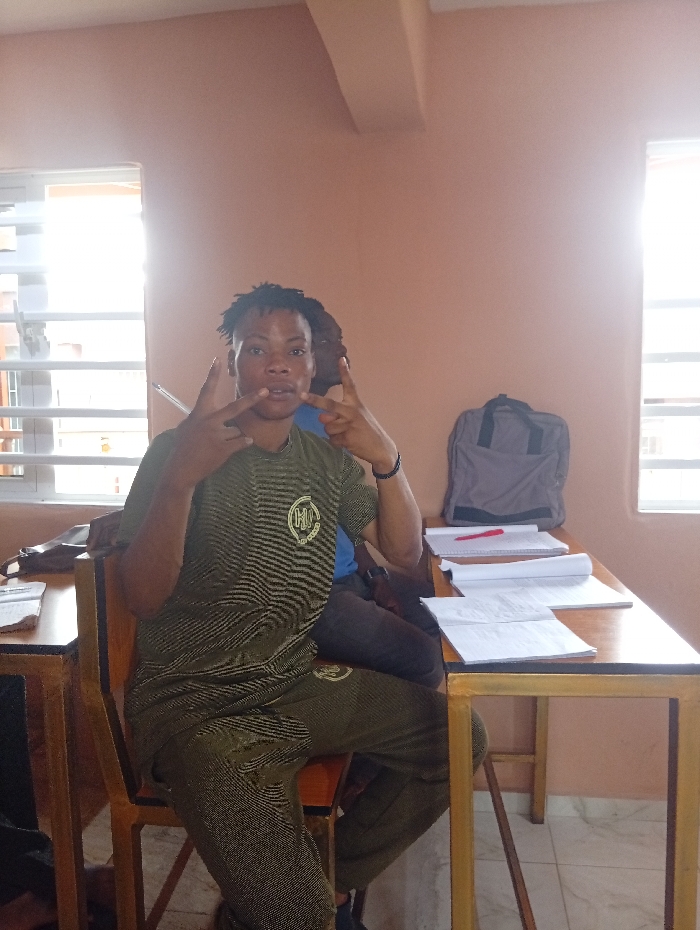 The scene takes place in an interior room in Benin City, Nigeria, appearing to be a classroom or study area