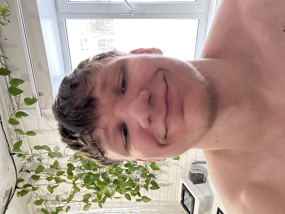 A fair-skinned male, appearing to be in his 20s-30s, is centered in a close-up selfie, smiling slightly with his eyes directed downwards and to the left