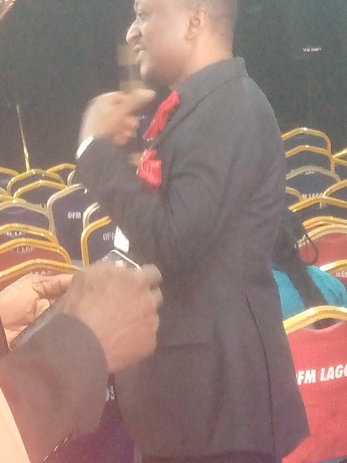 The image depicts an indoor event setting in Ado, Nigeria. A dark-skinned male, approximately in his 30s or 40s, is the primary subject, seen in profile looking towards the right side of the frame with a smiling expression. He wears a dark suit jacket, a light-colored shirt, and a prominent red tie or neck accessory around his collar, with a red element pinned to his chest. His right arm is bent, with the index finger extended in a pointing gesture. A silver-toned watch is visible on his left wrist. In the lower-left foreground, a dark-skinned hand, wearing a dark sleeve, holds a white rectangular object, likely a smartphone or ID card. The background shows rows of chairs, some dark blue with gold-colored frames bearing the inscription "DFM," and others red with "FM LAGOS" visible in white text on their backrests. A person wearing a light blue garment is partially discernible seated among the red chairs in the mid-ground. The environment is lit by artificial light.