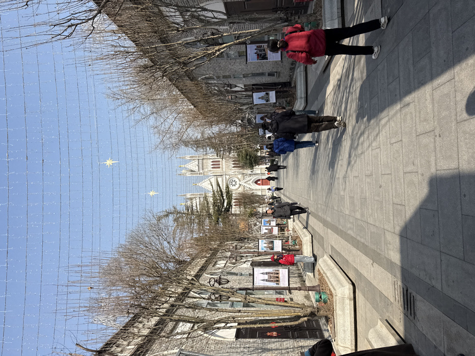 The image depicts a pedestrian street in Beijing's Xicheng District, leading directly towards the Immaculate Conception Cathedral (Xuanwumen Church). The street is paved with light grey rectangular blocks, featuring darker central stripes. On both sides, multi-story buildings constructed of grey brick or stone exhibit arched windows and doorways, with some doorways displaying traditional red Chinese couplets. Bare deciduous trees line the street in stone planters, interspersed with vertical display boards showcasing images of the church and related information. Dark ornamental lampposts are visible on the left. Overhead, numerous strings of small white lights are suspended across the street, along with several golden star-shaped ornaments against a clear blue sky. At the end of the street, the Immaculate Conception Cathedral stands prominently, characterized by its white/light-colored Gothic Revival architecture, multiple spires, a large central rose window, and a distinct red main entrance. A cross is visible atop the highest spire. Approximately 15-20 individuals are present on the street, walking in various directions. Most are casually dressed in winter or early spring attire, such as jackets and coats. Harsh shadows are cast on the pavement from the trees and pedestrians, indicating bright sunlight.