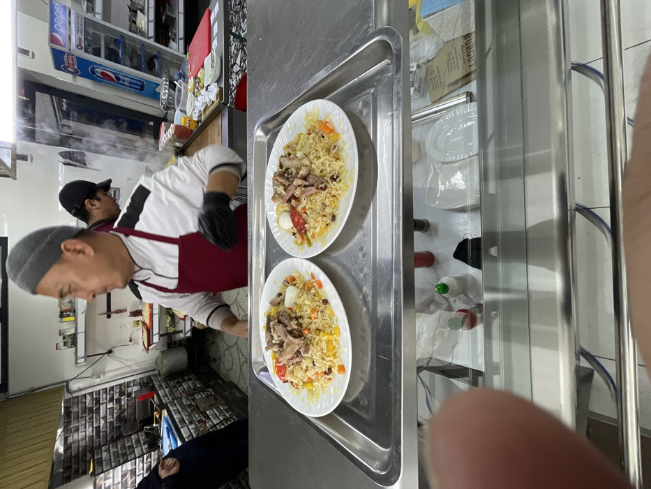 The image displays a commercial kitchen or food preparation area within a restaurant setting, located in Chinabad, Uzbekistan
