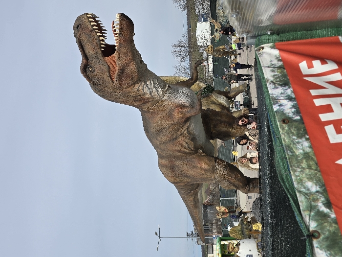 The image captures an outdoor dinosaur exhibition in Pleven, Bulgaria, under a clear, light blue sky