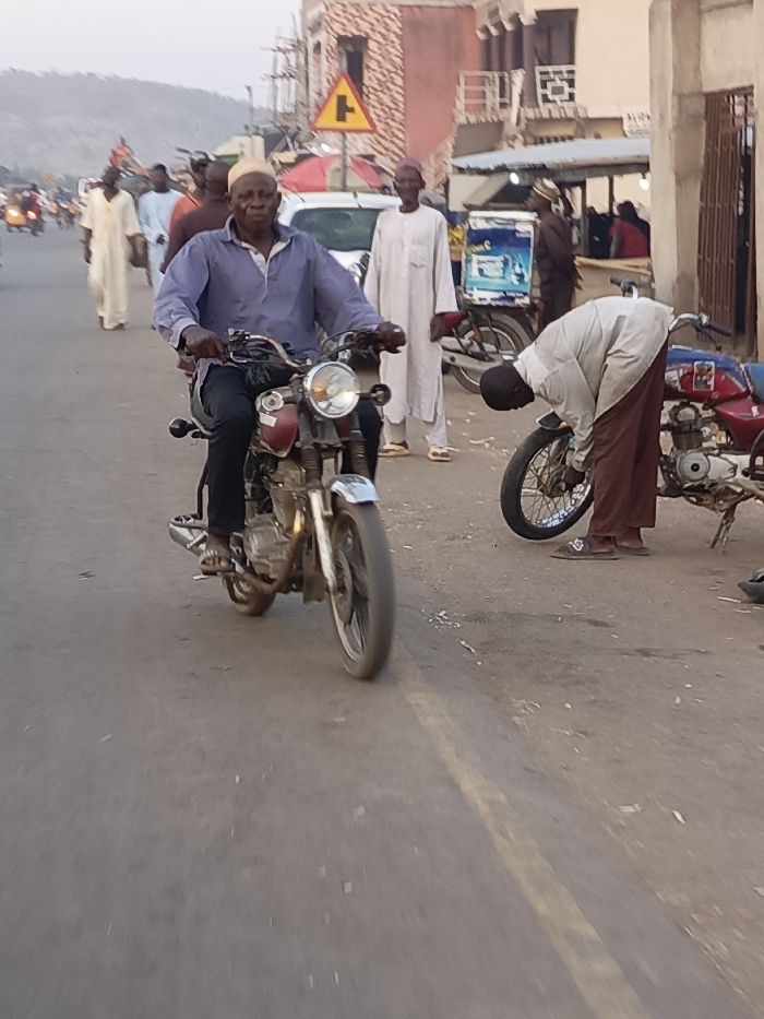 An elderly man in a light blue shirt and white cap rides a red motorcycle on a street. Several men wearing traditional white clothing stand nearby, one bending over another motorcycle. A street sign with a "T" intersection symbol is visible in the background. The scene appears to be in a town, with buildings and other people in the distance.