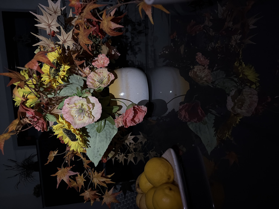 The scene is an interior view in Dos Hermanas, Spain, depicting a static arrangement on a dark, highly reflective surface, likely a polished table. The primary subject is a floral centerpiece, situated in the upper-right quadrant. This centerpiece comprises a rounded, two-toned ceramic vase, white transitioning to a light yellow/beige at its top, holding a dense bouquet of artificial or dried flowers and foliage. The bouquet features several bright yellow sunflowers with dark centers, multiple light pink poppy-like flowers with visible stamen structures, and additional smaller red or dark pink floral elements. Numerous autumnal maple-like leaves, in shades of orange, red, and brown, are interspersed throughout the arrangement. To the lower-left, an off-white rectangular plate contains a cluster of approximately five bright yellow lemons. The dark surface prominently reflects the floral arrangement and elements of the vase and lemons below them. The background is dimly lit and out of focus, showing indistinct forms of furniture or decor. No individuals are present in the image, and no active events are depicted.