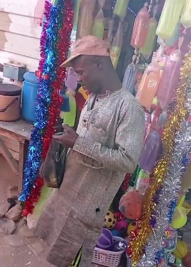A man stands in front of a shop decorated with colorful garlands. He is wearing a light-colored patterned shirt, shorts, and a baseball cap. He is holding a dark plastic bag and looking at a phone in his hand. The shop sells toys, plastic containers, and other items. There is a wooden table with containers on it to the left of the man. The ground is dirt. Someone walks by the left of the man.