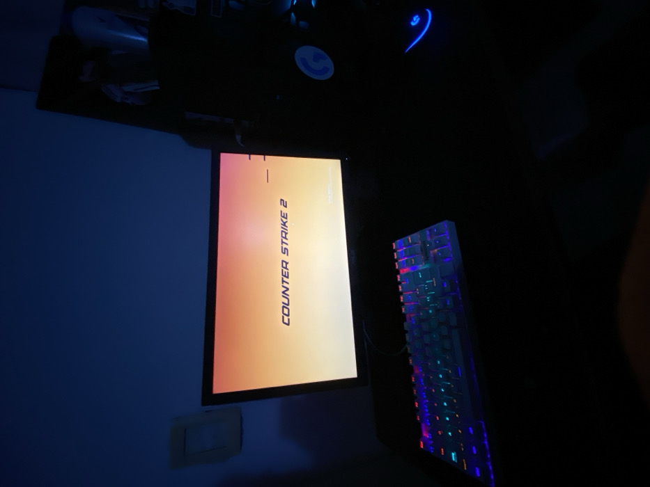 A tilted close-up shows a gaming setup. A monitor displays "Counter-Strike 2" with a peach-to-white gradient background. Next to it, a white keyboard with vibrant RGB lighting is visible. The wall is a light blue. Dark areas contain a mousepad, mouse and ambient lighting. A power socket is visible behind the monitor. The image is shot with a slight rotation.