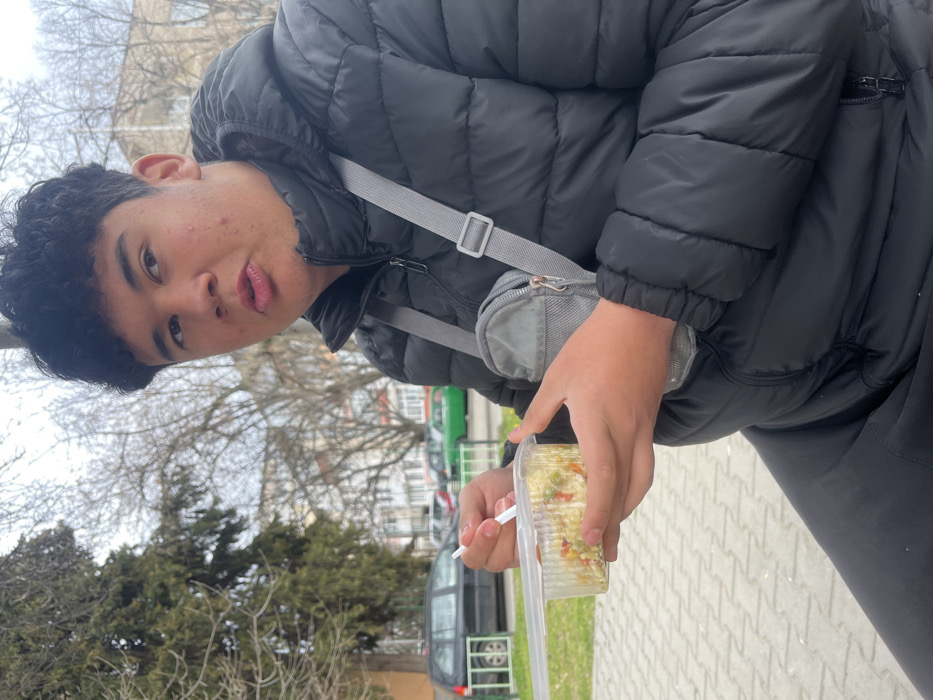 An outdoor scene in Stara Zagora, Bulgaria, depicts a young male seated on a paved surface, engaged in eating. The individual, with dark, curly hair and a medium complexion, wears a black puffer jacket and dark pants. A grey shoulder strap bag with a small pouch is worn across his chest. He holds a transparent, rectangular plastic container of food in his left hand, containing what appears to be a mixed salad or rice dish with vegetables (peas, corn, carrots). A white plastic fork is held in his right hand, positioned within the food. His mouth is slightly open, and his gaze is directed towards the viewer's right. The ground beneath him is paved with light-colored interlocking tiles. In the background, deciduous trees with bare branches and an evergreen conifer are visible. Beyond the trees, residential buildings with multiple stories are present. Several vehicles, including a black station wagon and a green sedan, are parked on an asphalt surface further in the background. The sky is overcast.