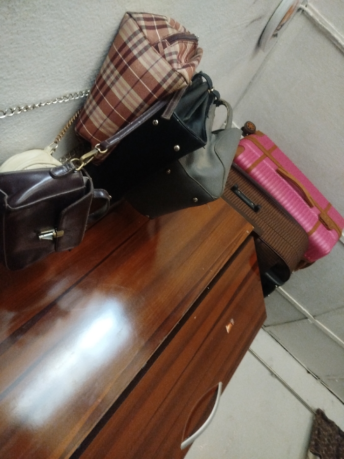 - "The scene, located in Mape, Nigeria, depicts an indoor environment with multiple bags and luggage positioned on a dark brown wooden dresser against a light-colored wall" by FM-3EyKx2, licensed under CC BY 4.0