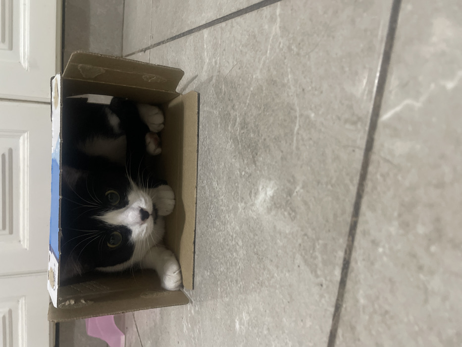 - "A black and white cat is nestled inside a cardboard box, which is placed on a tiled floor" by FM-uxU7C3, licensed under CC BY 4.0
