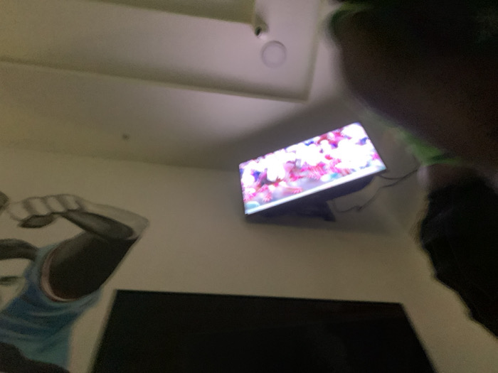 A low-angle, interior photograph depicts a dimly lit room with light-colored walls and a white ceiling. A recessed circular light fixture and a small, dark sensor are present on the ceiling. A wall-mounted flat-screen television is visible in the upper right quadrant, displaying an illuminated abstract image characterized by bright pink, purple, and white elements. Wires extend from the bottom of this television. Below it, a large, dark, rectangular object, consistent with a powered-off display screen, occupies the lower central area. The left wall features a partial mural or artwork depicting the torso and flexed arm of a figure clad in a light blue shirt. The upper right edge of the frame is partially obstructed by a dark, out-of-focus mass, consistent with a human head or shoulder, with a small green element visible. No specific identifiers within the image corroborate a location in Kubwa, Nigeria.
