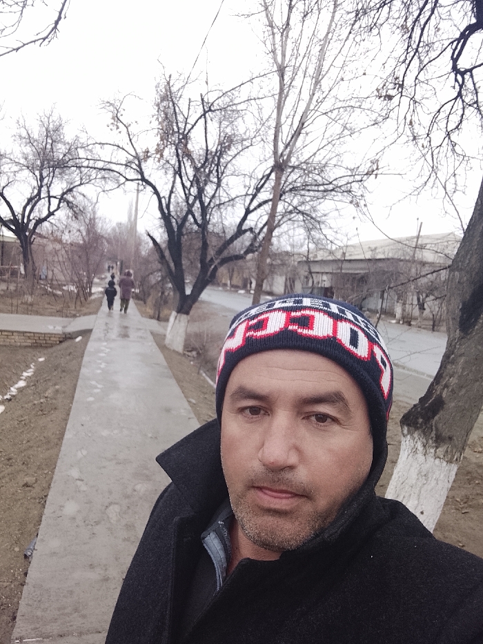 The image is a selfie taken in Yangiaryk, Uzbekistan, featuring a male subject in the foreground
