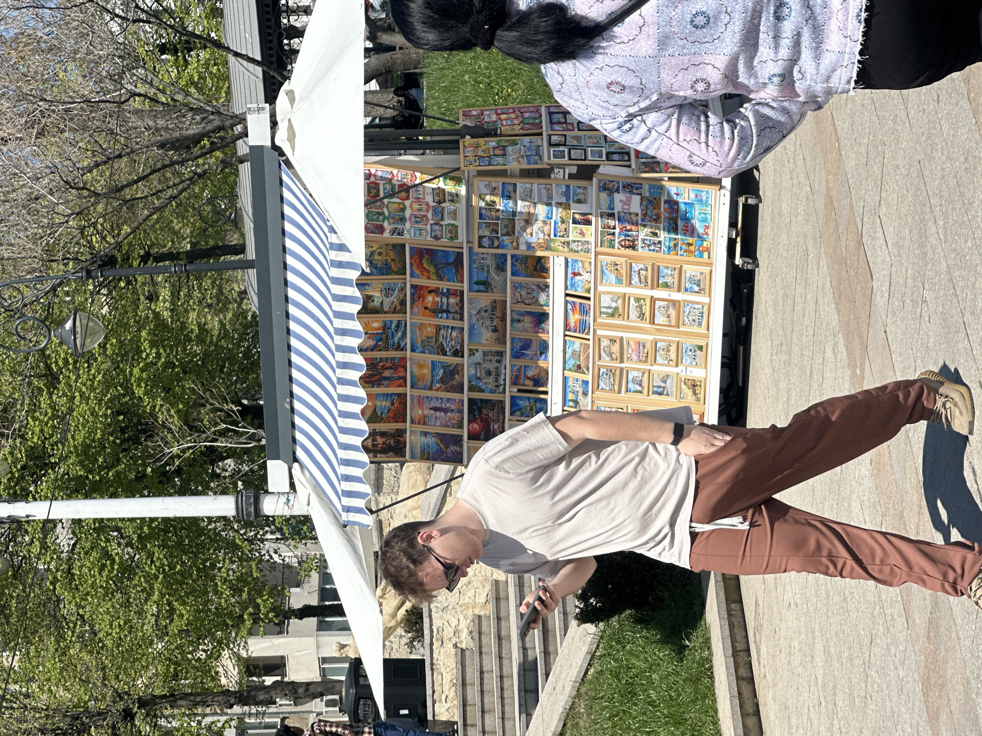 The image depicts an outdoor scene, possibly in Constanța, Romania, given the presence of artwork displayed for sale. The setting is a paved area adjacent to a grassy area, with trees in the background. A man wearing a light-colored t-shirt and brown pants stands looking at a phone in his hand. He is positioned near a vendor's stall displaying numerous framed paintings and postcards. A woman, partially visible, stands next to the stall. The vendor's stall has a striped awning. The displayed artwork varies in style and subject matter. The overall impression is that of an outdoor market or art fair.