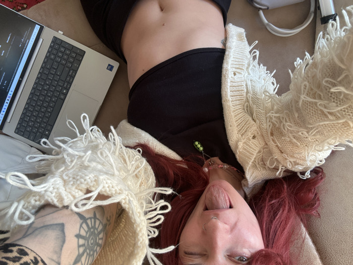 The image depicts a close-up, overhead view of a single individual lying on a light brown upholstered surface in an indoor setting in Batumi, Georgia. The individual, appearing to be female, has long, wavy red hair. Her left eye is open, while her right eye is winking, and her tongue is extended from her mouth. She has a nose ring on her left nostril and a septum piercing. She is wearing a cream-colored, heavily textured, open-front cardigan with numerous loose yarn strands, over a black crop top that exposes her midriff, and black bottoms. A multi-strand necklace with pink beads, star charms, and a green beaded charm resembling pea pods is visible around her neck. A circular tattoo is present on her upper left arm/shoulder area. To the right of her body, a silver laptop is open, displaying an interface with text and possibly media content on its screen. On the lower left of the frame, near her hip, white over-ear headphones and a white cylindrical object are visible. The individual is positioned facing upwards towards the camera, suggesting a selfie.