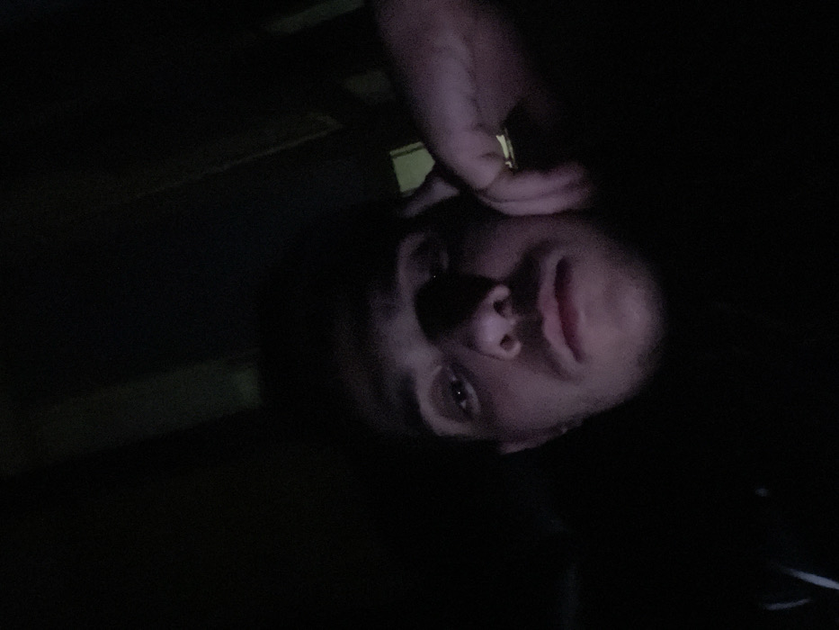A person is shown in a dimly lit setting. Their face is visible with one hand near their head. The image is turned so that the person's head appears on the right side. Some linear objects appear in the top left of the image that look like edges of wooden planks. The scene is dark.