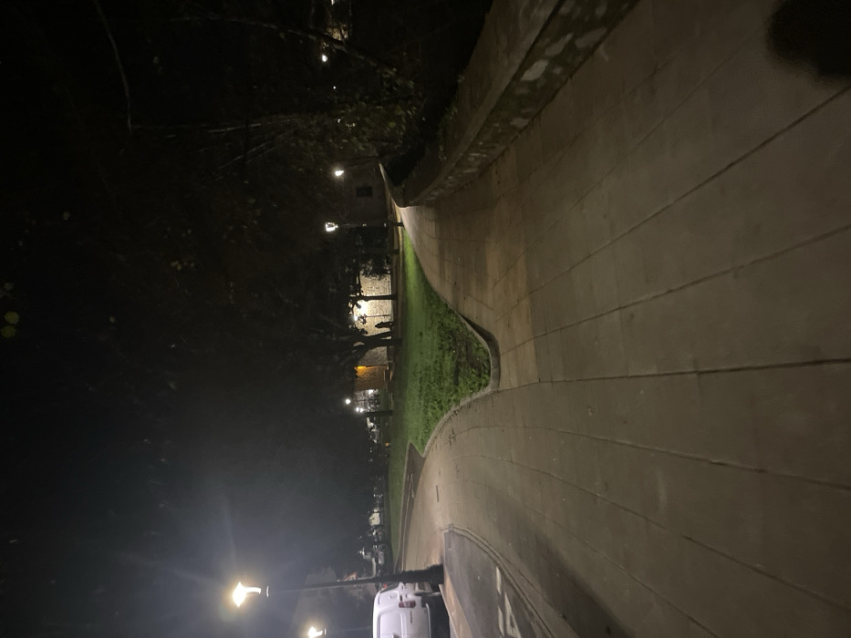 A dimly lit park path curves to the left, bordered by green grass and trees on one side and a paved walkway on the other. Streetlights illuminate the scene, casting a soft glow on the path. A white van is partially visible in the foreground, near the bottom of the frame. The night sky is dark, with minimal visible details beyond the lights.
