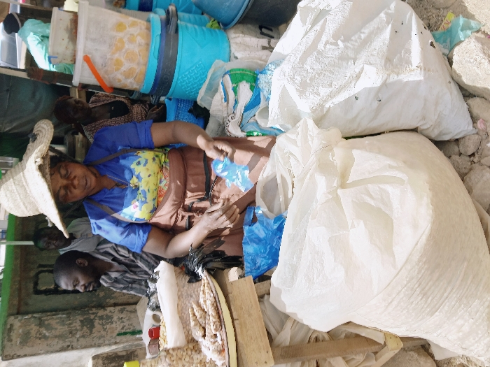 The image depicts an outdoor market stall scene in Gweru, Zimbabwe. An adult female, positioned centrally, wears a wide-brimmed straw hat, a blue short-sleeved top over a floral pattern, and a brown apron. She is observed holding a crumpled blue plastic bag, with her gaze directed towards her hands, indicating an action involving preparation or packaging of goods. To her left, on a low wooden table, rests a light-colored tray displaying loose white nuts and elongated conical snacks, alongside a yellow-capped bottle. To her right, a stack of blue and clear plastic buckets contains various bulk items, with the uppermost clear container holding yellow-orange objects. The immediate foreground features two large, white woven bags, filled with bulk contents, resting on uneven, rocky ground. In the background, behind the central figure, a bearded adult male in a striped shirt is visible looking left, along with at least two other individuals partially obscured. The background includes a weathered wall with patches of faded green and blue paint. The scene is illuminated by daylight.
