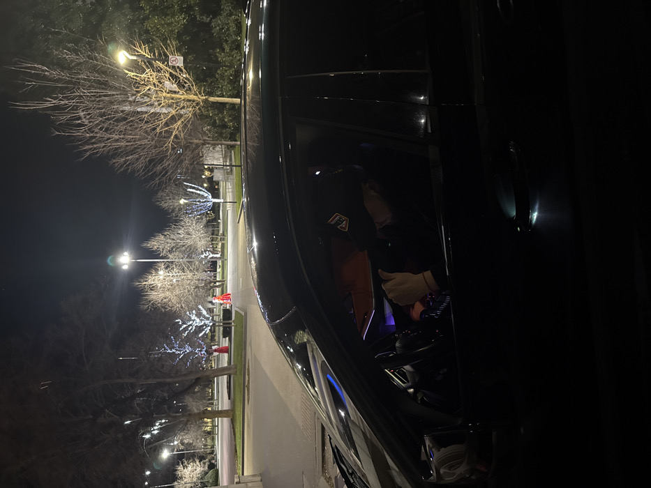 The image depicts a nighttime scene within a city center park in Pleven, Bulgaria. In the foreground, the side profile of a dark sedan is visible, occupying the lower half of the frame. The driver's window is open, revealing a person seated at the steering wheel. This individual wears a dark cap with a light-colored emblem on the front and a dark jacket. Their left hand, adorned with a dark bracelet, rests near the steering wheel. The car's interior features subtle blue and purple ambient lighting on the dashboard and an orange accent on the visible door panel. Beyond the vehicle, a paved surface transitions into a park area. Numerous deciduous trees with bare branches are present, many adorned with white string lights, creating illuminated silhouettes. Multiple tall streetlights cast bright, circular beams of light across the park. In the mid-ground of the park, two distinct red, geometric structures are visible, flanked by additional trees, some decorated with blue string lights. The background consists of more parkland extending into the darkness, illuminated by scattered artificial light sources against a clear night sky.