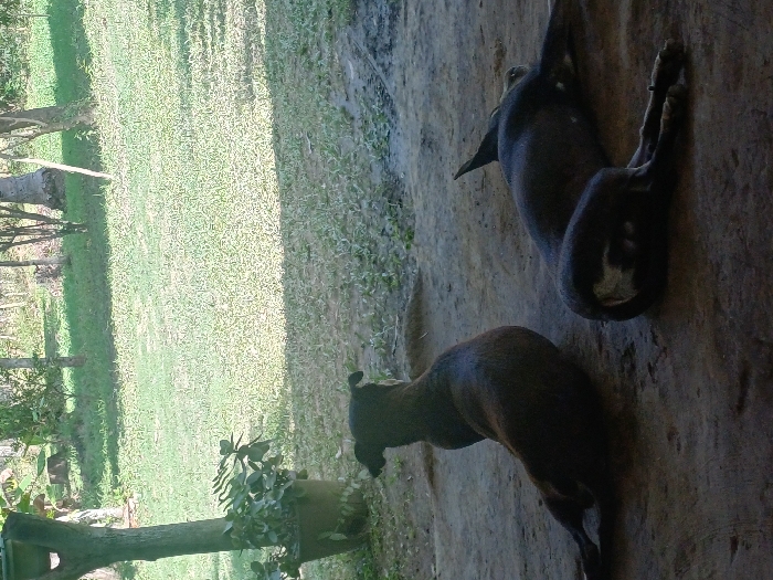 The image depicts an outdoor scene in Cotorra, Colombia, with a foreground shaded by an unseen overhead structure, contrasting with a brightly lit background. Two dark-colored canines are resting on a dark, uneven dirt surface in the foreground. The canine on the left is seated with its back to the camera, facing towards the background. The canine on the right is lying on its left side, with its head out of frame; it exhibits distinct white markings on its right hind leg and tail area. To the far left, a light-colored tree trunk or wooden post stands, with a green-leafed potted plant situated at its base. The background comprises a field of green grass, illuminated by direct sunlight, with multiple trees and shrubs scattered throughout.
