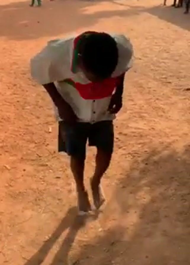 two men in an outdoor dirt area, possibly a village square, in front of a gathering of people. The men are wearing short pants and shirts, and have objects attached to their ankles. The objects appear to be metallic and make noise as the men move. Both men are performing movements that suggest dancing or some kind of physical performance. The camera moves around them to capture their actions. There are buildings visible in the background and many observers around the edges of the open space.