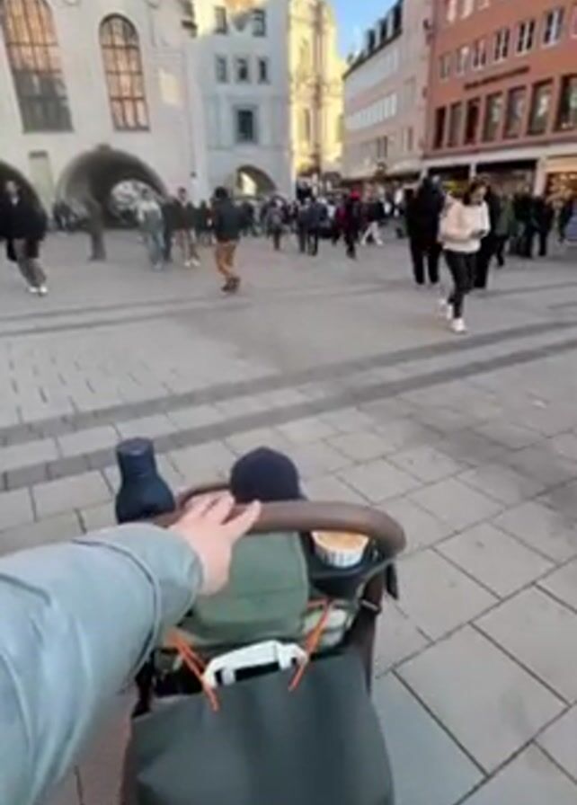first-person perspective of someone pushing a stroller on a paved town square. The stroller contains a child wearing a blue hat and a shopping bag with the word "TORQUATO" printed on it. The person pushing the stroller touches the back of the child's head. In the background, there is a crowd of people walking around and several multi-story buildings. The sky is blue and the sun is shining.