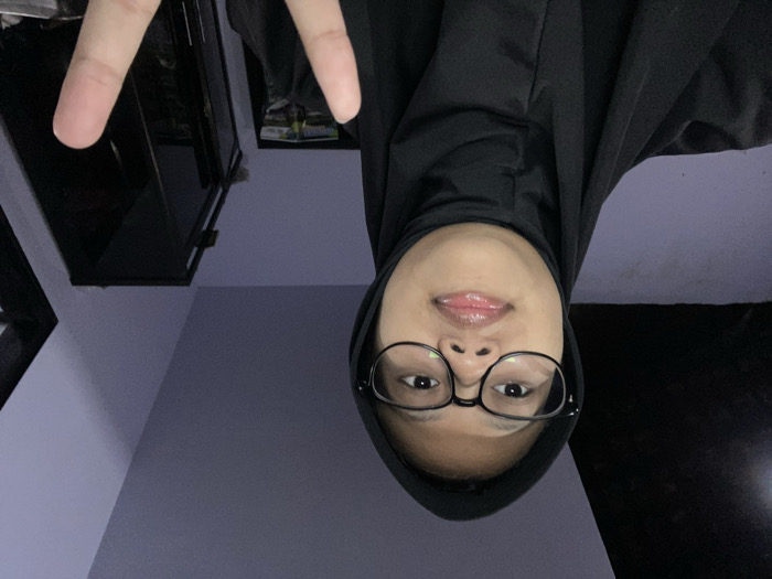 A single individual, appearing female, is centered in a medium-close-up indoor selfie. She wears a black hijab, black-framed glasses, and has a neutral expression with slightly parted, glossy lips. Her right hand (viewer's left) is visible in the lower right quadrant, forming a "peace" sign with the index and middle fingers extended. The background consists of a light purplish-grey wall and ceiling, with a dark segment indicating a corner or structural division. A dark, reflective piece of furniture, possibly a cabinet, is partially visible on the right side of the frame. The scene is illuminated by dim, ambient light. The described location is within the city of Kebonsari, Indonesia.
