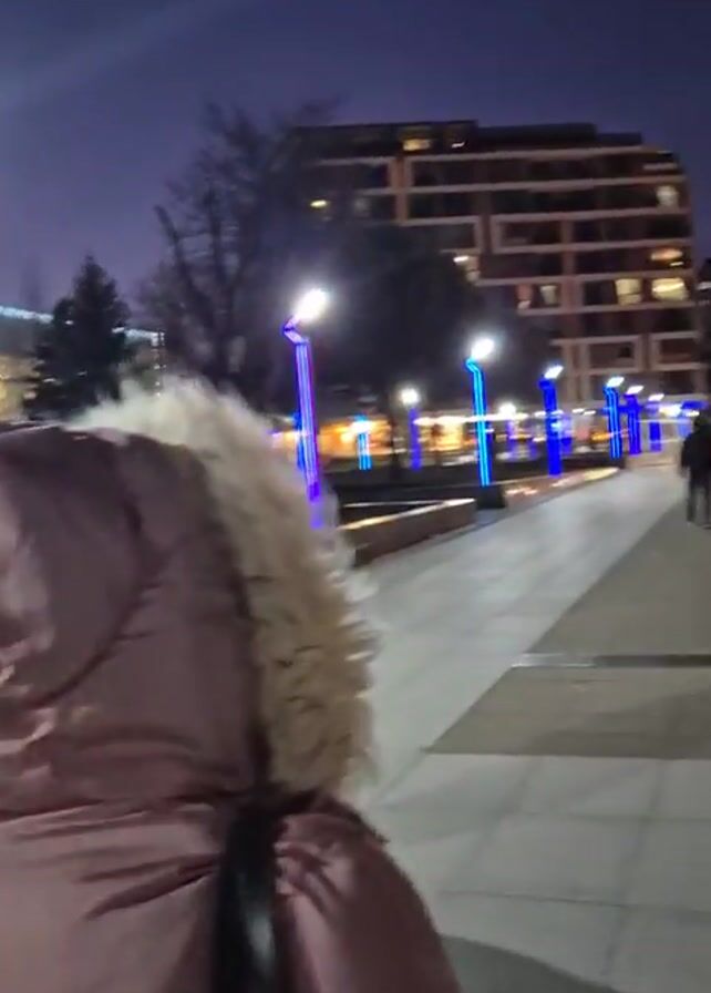 n evening view of a city square. People stroll along a paved walkway illuminated by streetlights. In the background, a large building with the words "СЪДЕБНА ПАЛАТА" (Courthouse) is lit up. A tall monument stands in front of the building. Trees in the square are decorated with strings of lights. The video begins with a close-up of a person in a pink jacket, then pans across the square.