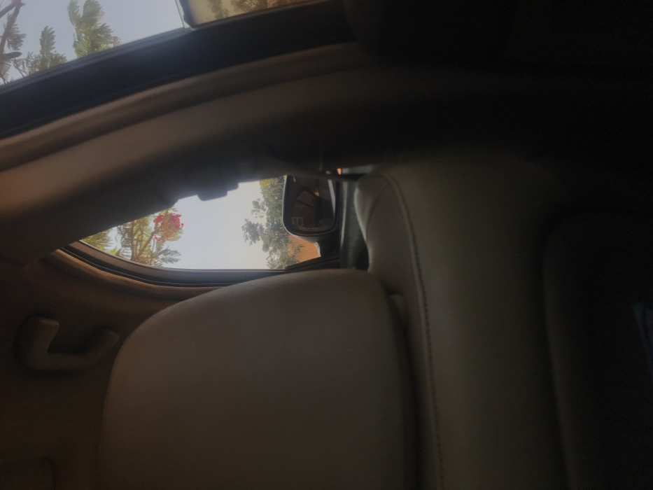 The image displays an interior perspective from a vehicle located in Miango, Nigeria. The foreground is occupied by the beige upholstered back and headrest of a car seat, positioned on the left side of the frame and showing stitched seams. Above the seat, a light-colored ceiling grab handle is affixed to the vehicle's headliner. To the right, parts of a dark interior pillar are visible, including a seatbelt component attached to it. Through the vehicle's window, a daytime exterior scene is visible. A dark vehicle side mirror is present on the right-hand side, reflecting an indistinct area. Beyond the vehicle's structure, a tree with green foliage and clusters of red-orange flowers is partially visible against a light, hazy sky. In the deeper background, additional green trees and reddish-brown ground are discernible, indicating a vegetated, possibly rural or semi-rural environment. No individuals are depicted, and no specific actions or interactions are occurring.