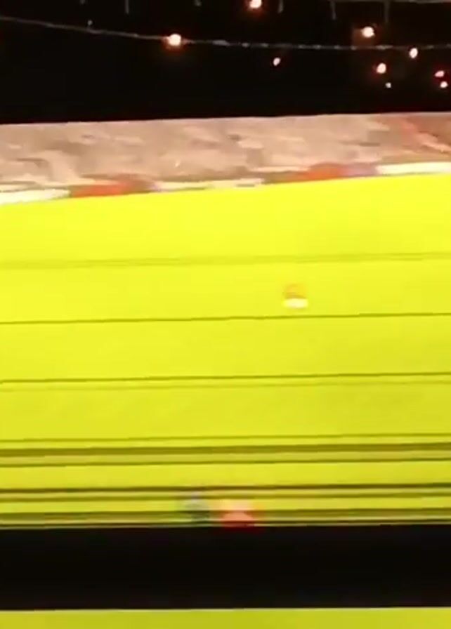 large screen displaying a soccer game. The field is green, and the players are wearing red and white uniforms. The score is NFO 0, ARS 0. There is a crowd in the background. The screen has some horizontal lines running across it. A person is silhouetted in the foreground. There are string lights overhead.