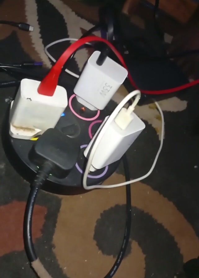 cluttered indoor scene. At the start, a power strip with several adapters plugged in is visible. The camera then moves to show the surrounding area, revealing a cluttered carpet with discarded plastic cups, bottles, and other debris. The video ends with a view of the floor covered in various items, indicating a messy environment. There are people in the background but only partial views.
