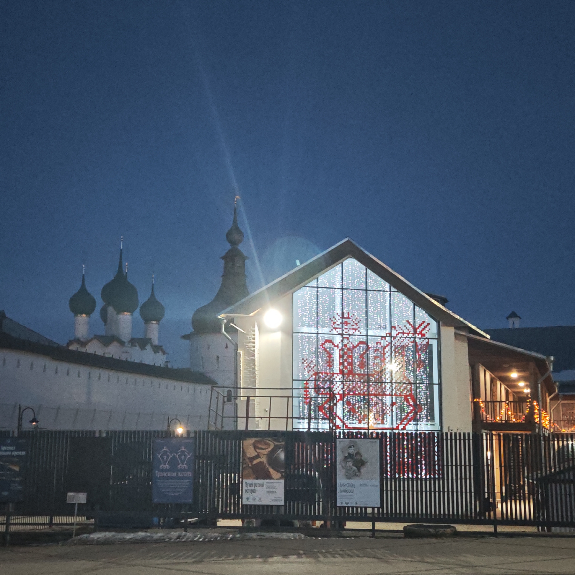 building in Ново-Никольское, Russia, decorated with lights, likely for a holiday season. The building is a single-story structure with a large window displaying a pattern of lights. The scene is at night, with a dark sky in the background. To the left of the building, there's a view of a historical structure, possibly a monastery or church, with distinctive domes. In front of the building, a metal fence runs along the street, with posters attached to it. The ground is partially covered in snow or ice. The overall scene suggests a blend of historical architecture and modern festive decorations.
