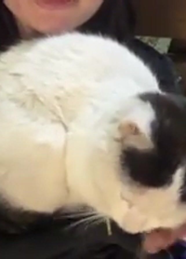 A woman with long dark hair and pink lips is holding a black and white cat on her lap. The cat is curled up and appears to be sleeping. They are sitting on a wooden bench outdoors. The background is blurry, but suggests a park or public space. The camera is held close to the woman.