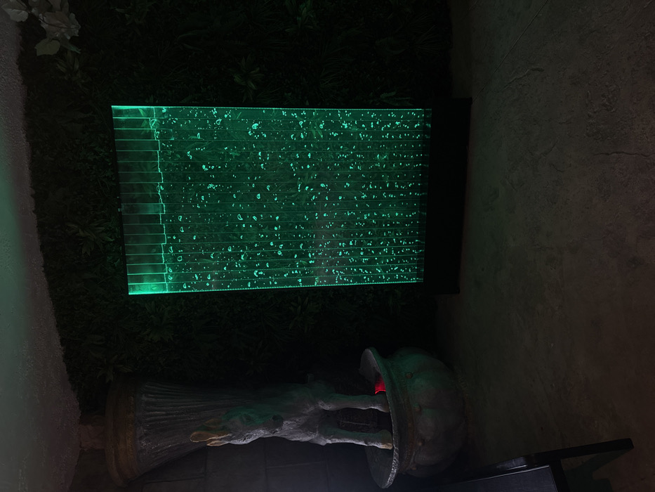 The scene depicts an interior or semi-enclosed exterior space with dim, atmospheric lighting. To the right, a prominent vertical bubble wall, approximately 1.8 meters tall, is illuminated internally with a vibrant green light, showcasing a continuous upward flow of air bubbles within its clear panels. This unit is supported by a dark, rectangular base. To the left of the bubble wall, a light-colored statue, resembling a horse or donkey, stands approximately 1.2 meters tall within a large, dark, weathered stone or ceramic pot, which functions as a fountain basin. Water is observed cascading into the pot from an overhead, obscured source. A subtle red glow emanates from within the fountain basin, near the base of the statue. Behind the fountain, a dark, rough-textured wall, possibly constructed from stone blocks, extends vertically. Above the fountain, a decorative architectural element with a fluted design and a metallic-colored rim is integrated into this wall structure. The background wall extending behind the bubble wall is covered with dark green artificial foliage. The floor is a dark, textured surface, likely concrete or large flagstones. A dark, angular object, possibly a furniture component such as a bench leg, is partially visible in the lower-left foreground. No individuals or active interactions are present in the image. The specific location within Krasnovo, Bulgaria, is not discernible from the visual information provided.