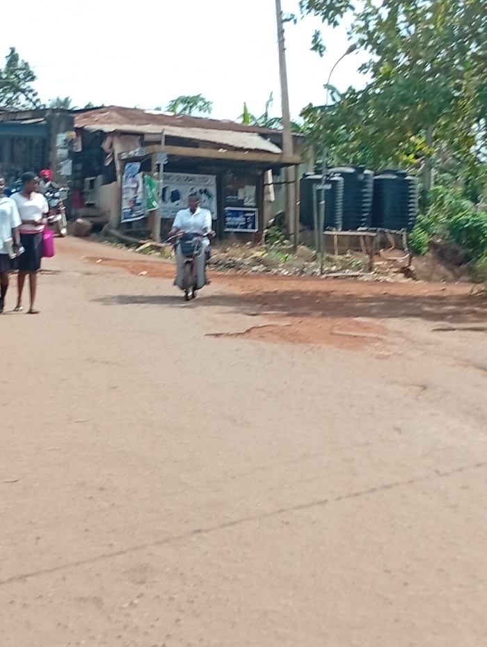 This image captures a daytime street scene in Nsukka, Nigeria. The foreground presents a reddish-brown unpaved road surface with visible undulations. In the mid-ground, a person wearing a white short-sleeved shirt is operating a reddish-brown scooter, facing towards the viewer. To the left of the scooter, two individuals are walking. One person, dressed in a white top and dark lower garment, carries a pink shoulder bag. The second person is partially visible, also in a white top. On the left side of the road, a row of single-story structures with corrugated metal roofs are visible, appearing to function as shops or stalls. Multiple posters and signs are affixed to the fronts of these buildings, including one depicting shoes and another blue-colored sign. A tall utility pole stands to the right of these structures, extending upwards. Further to the right, three large, black, plastic water storage tanks are prominently displayed on a raised wooden platform. The background on both sides is characterized by dense green foliage and trees. The overall environment suggests a semi-urban or rural setting.