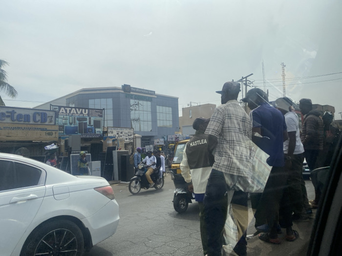 This daytime street-level image depicts a busy urban commercial area in Maiburiji, Nigeria, under an overcast sky