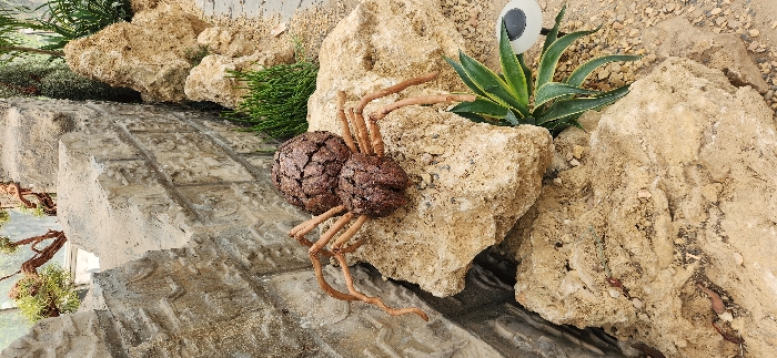 This image depicts an outdoor decorative landscape feature located in Baiyun District, China. The central focus is a large, dark brown, artificial spider sculpture resting on a prominent, irregularly shaped, light tan rock in the mid-ground. The spider consists of two primary segmented body sections and eight segmented legs, all exhibiting a textured, fissured appearance. To the immediate left of the spider and rocks, a substantial, light grey-tan wall stands vertically. This wall displays a rough, carved surface with repeating geometric or stylized block patterns and an uneven, crenelated top edge, suggesting a decorative or mock-ancient architectural style. Several natural elements surround the sculpture and wall. Below and to the right of the spider, a green succulent plant with broad, variegated leaves is visible. Further to the right and along the base of the wall, clusters of slender, bright green, upright bushy plants are present. The ground surface is composed of small, light brown and tan gravel or pebbles. In the upper left background, behind the wall, parts of a mature plant with exposed reddish-brown roots or branches are visible, suggesting further botanical elements in the broader environment. A small, white, dome-shaped object, possibly a garden light, is partially visible on the far right. The scene is illuminated by natural light, casting subtle shadows. No human figures are present.