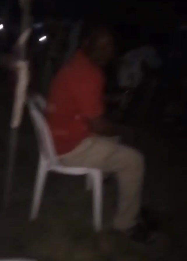 nighttime gathering, possibly a party or outdoor event, with several people in attendance. The lighting is dim, and the video quality is poor, making it difficult to discern fine details. People are generally standing and moving around in the background. In the foreground, several people are seated on white plastic chairs. One individual wears a red shirt and khaki pants, while another is a child wearing a checkered shirt. The general atmosphere suggests a social event in a poorly lit outdoor location.