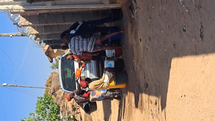 People stand around a silver van, loading items into the back. One person holds an orange bucket. Luggage, containers, and a yellow cooler are also being loaded. An older woman sits on a yellow bucket wearing a dress, while another person stands beside her. A man in a suit walks away from the van. The location appears to be a dirt road near a building with barbed wire.