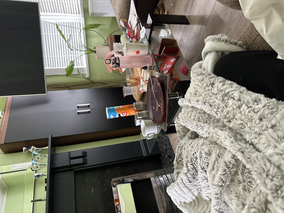 The scene is an indoor living space located in Dorchester, United Kingdom. The room features light green walls and light wood laminate flooring. On the left, a black fireplace mantelpiece is present, adorned with a dark candle holder containing a green candle and three silver and blue decorative trophies or figurines. To the right of the fireplace, a tall, dark brown and black wardrobe with two vertical silver handles stands against the wall. A wall-mounted television is partially visible at the top center of the frame. A window with white horizontal Venetian blinds is visible on the right, with a white radiator positioned beneath it. A small light-colored side table near the window holds a potted plant with broad green leaves. In the mid-ground, a cluttered glass-top coffee table with black legs is prominent. Resting on the table are: a maroon oval plate with food remnants and a silver fork; a white ceramic mug; an orange Pringles can; a salt shaker and a pepper shaker; a pink water bottle with a black lid; multiple clear plastic cups, one with a McDonald's logo; a small bottle containing liquid, possibly vape juice; a wooden circular board; an open red box, partially obscured but showing "Heartland" and "10"; and various crumpled red and white food wrappers. In the immediate foreground, a person's legs, dressed in dark trousers, are visible, partially covered by a light grey, fluffy textured blanket, indicating an individual is seated on a sofa or armchair.