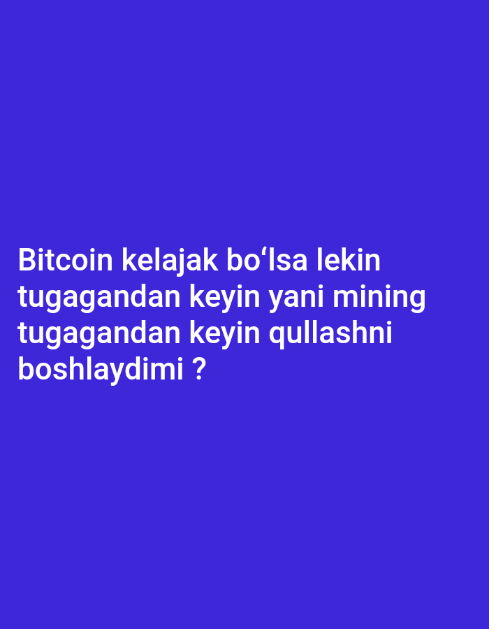 The image displays a text in Uzbek language, asking whether Bitcoin will be the future, but will its usage start to decline after mining stops. The text is white and the background is blue.