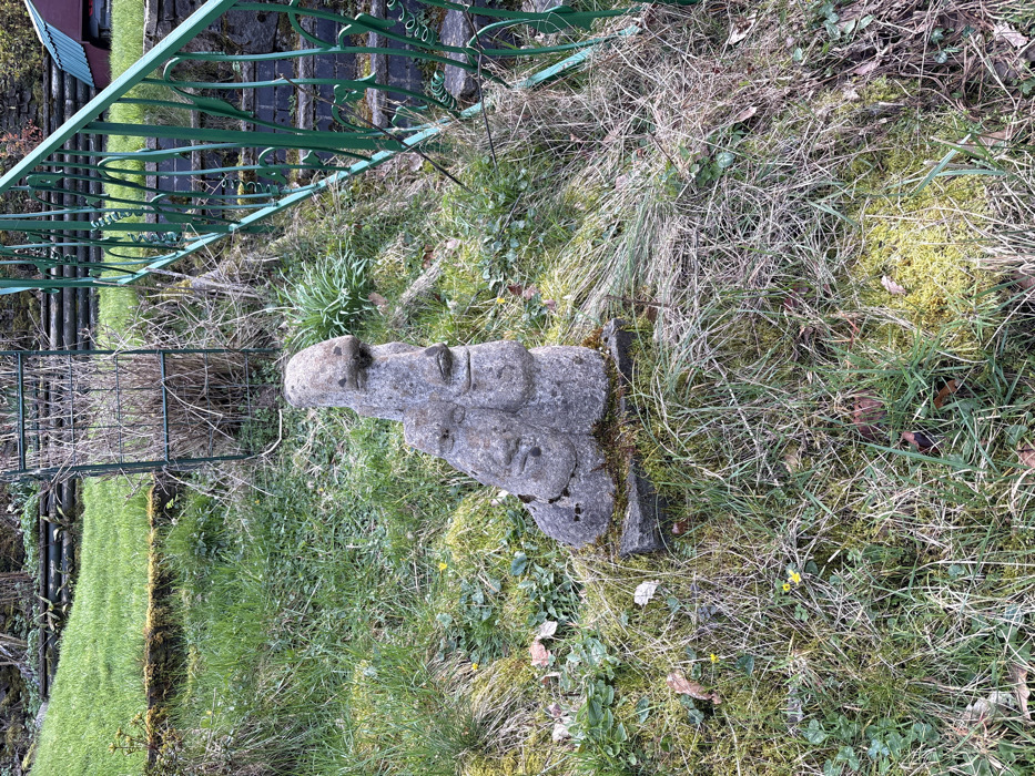 - "The image depicts a weathered, light gray stone sculpture of three stylized faces or figures stacked vertically, positioned centrally on a grassy, moss-covered slope in Minsterley, United Kingdom" by FM-RPcgE2, licensed under CC BY 4.0