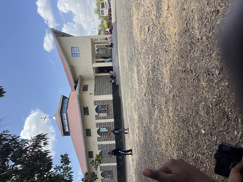 A church stands tall under a blue sky with scattered clouds. The building features a tan facade with stone accents and a red roof. People are gathered on the front steps, while others stroll along the side. The foreground shows a gravelly ground with some vegetation and a hand holding a black object.