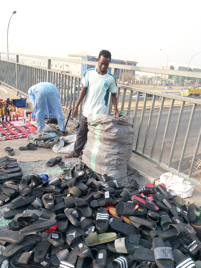 An elevated outdoor market scene in Kagini, Nigeria, depicts two individuals attending to merchandise during daytime. On the right, a young adult male with dark skin and short dark hair stands, looking downward and slightly right with a faint smile. He wears a light-colored short-sleeved t-shirt with a blue design and dark trousers, appearing barefoot or in dark, indistinct footwear. His left hand is positioned near a large, upright, light grey/brown woven sack with a green stripe. To the left, a second individual, wearing a light blue, long-sleeved traditional garment and dark trousers, is bent over, facing away from the camera. This person is arranging or examining various small bottles, packaged goods, and potentially watches or jewelry displayed on a red cloth spread on the ground. A blue basket rests on the red cloth near this individual. A large, disorganized pile of numerous slide sandals, predominantly black with various accent colors including olive green, grey, red, blue, and white, occupies the foreground and extends towards the standing man. Some sandals exhibit visible brand logos. The market area is set on a paved surface, bordered by a multi-bar metal railing. Beyond the railing, a multi-lane roadway with sparse vehicle traffic is visible, including cars and a yellow truck. Several buildings with light-colored facades and blue-tinted windows are present in the background under a hazy, bright sky. A tall street light pole is visible on the far left.
