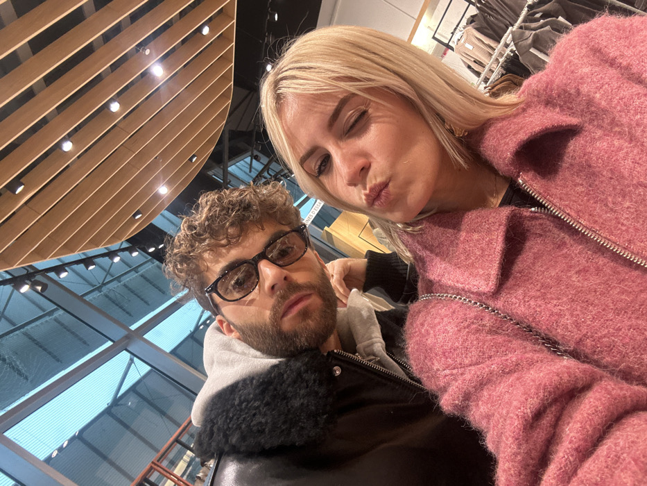 A close-up selfie captures two individuals inside a modern retail store, identified as likely within the Cap3000 shopping center in Saint-Laurent-du-Var, France, based on discernible "CABINES D'ESSAI" (fitting rooms) signage and contemporary architectural features. On the left, a male subject with curly brown hair, a beard, and black-framed glasses wears a dark jacket with a black faux fur collar over a grey hooded sweatshirt. He maintains a direct gaze at the camera. On the right, a female subject with shoulder-length blonde hair wears a textured, fuzzy pink coat with a silver zipper and a visible silver chain strap, along with a gold-colored earring in her left ear. She is depicted winking her right eye and puckering her lips towards the camera. The background reveals sections of the store's interior, including clothing racks displaying garments, a high ceiling with both translucent glass panels and wooden slats containing recessed spotlights, indicative of a commercial environment.