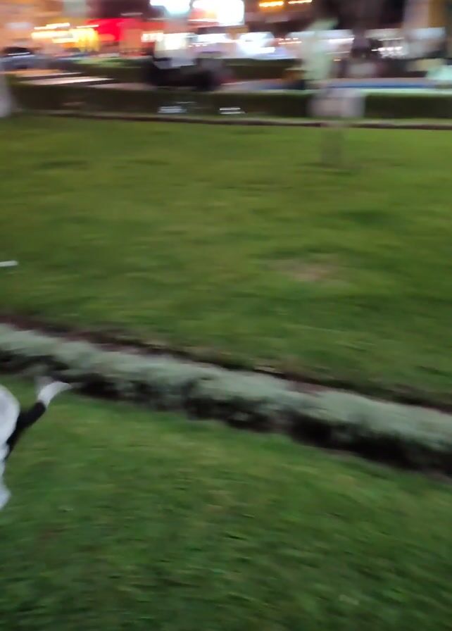 black and white dog running on a green lawn in what appears to be a park at night. The dog is wearing a harness and is initially moving quickly, then slows down to sniff the ground. A woman is visible to the left of the frame, and in the background, there are buildings, streetlights, and cars. The lighting suggests it is nighttime.
