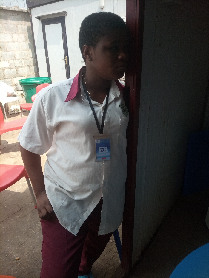 A young woman in a white short-sleeved collared shirt and maroon pants stands near a wall. The shirt has a burgundy-colored collar and a badge hanging from a lanyard around her neck. Her expression is somewhat serious as she looks to the side. The setting appears to be outdoors, with chairs and a trash bin visible in the background. The lighting is varied, creating shadows.